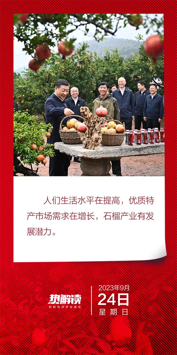 熱解讀9月24日下午,習(xí)近平總書記來到山東棗莊市嶧城區(qū)的冠世榴園石榴種質(zhì)資源庫,察看石榴樹種,了解當(dāng)?shù)厥穹N植歷史、種質(zhì)資源收集保存和產(chǎn)業(yè)發(fā)展情況,并來到石榴種植園中向老鄉(xiāng)們詢問今年石榴種植、收獲和收入情況。 總書記指出,人們生活水平在提高,優(yōu)質(zhì)特產(chǎn)市場需求在增長,石榴產(chǎn)業(yè)有發(fā)展?jié)摿ΑK`l(xiāng)親們生活像石榴果一樣紅紅火火。 總書記提到的“特產(chǎn)”二字強(qiáng)調(diào)了地域環(huán)境、歷史文化的獨(dú)特性,而“優(yōu)質(zhì)”則為“特產(chǎn)”指明了高質(zhì)量發(fā)展方向。 在上千年的石榴種植史上,生長于嶧城區(qū)連綿山脈上的棗莊石榴,可謂是地地道道的“土特產(chǎn)”。《嶧縣志》記載:“其陽多榴,味甘,久藏不腐,賈數(shù)千里,居人世擅其利。”如今在嶧城,有6200多戶、2萬余名農(nóng)民從事石榴種植。2022年,嶧城區(qū)石榴產(chǎn)業(yè)總產(chǎn)值達(dá)29.3億元。