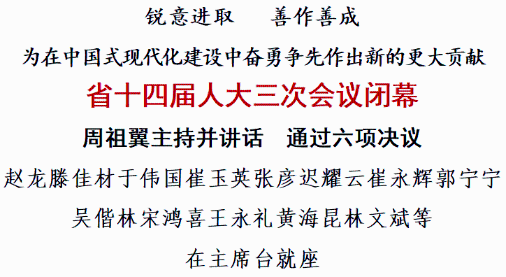 周祖翼指出,省十四屆人大三次會議圓滿完成各項議程,是一次民主團結、求真務實、凝心聚力的大會。會議期間,全體代表認真履職盡責,積極建言獻策,共謀發展大計,展現出飽滿的政治熱情、強烈的使命擔當和良好的精神風貌。 周祖翼強調,2025年是“十四五”規劃收官、“十五五”規劃謀劃之年,是深入貫徹落實習近平總書記在福建考察時的重要講話精神、接續譜寫新福建建設新篇章的關鍵一年。我們要按照本次會議確定的目標任務,把準前進方向,堅定信心決心,牢記囑托再出發、奮勇爭先再突破。必須堅定擁護“兩個確立”、堅決做到“兩個維護”,充分發揮獨特優勢,深學細照篤行黨的創新理論,主動將福建發展放在全國大局中來思考、謀劃和推進,全力把習近平總書記為福建擘畫的宏偉藍圖變為美好現實。必須全面貫徹新發展理念、扎實推動高質量發展,在推動科技創新和產業創新深度融合上闖出新路,在全面深化改革、擴大高水平開放上奮勇爭先,在探索海峽兩岸融合發展新路上邁出更大步伐,推動經濟持續回升向好,塑造發展新動能新優勢。必須堅持以人民為中心、持續增進民生福祉,用心用情用力解決好就業、社會保障、教育、醫療衛生等群眾急難愁盼問題,在推動區域協調發展和城鄉融合發展上作出示范,在提升文化影響力、展示福建新形象上久久為功,在實施生態省戰略上接續推進,建設更高水平的平安福建、法治福建,不斷增強人民群眾獲得感幸福感安全感。必須加強黨的建設、全面從嚴治黨,深入開展向谷文昌、廖俊波等同志學習活動,深入實施“堡壘工程”,全面落實“四下基層”制度,鞏固深化黨紀學習教育成果,全面落實整治形式主義為基層減負長效機制,堅決打好反腐敗斗爭攻堅戰、持久戰、總體戰。 周祖翼強調,要深入學習貫徹習近平總書記在慶祝全國人民代表大會成立70周年大會上的重要講話精神,大力發展全過程人民民主,堅持好、完善好、運行好人民代表大會制度,不斷提高新時代新征程我省人大工作質量和水平,為推進中國式現代化福建實踐提供堅實法治保障。要始終堅持黨對人大工作的全面領導,保證黨的理論、路線、方針政策和決策部署在人大工作中得到全面貫徹。要不斷提高立法質量,加強重點領域、新興領域、地方特色立法。要切實增強監督實效,實行正確監督、有效監督、依法監督,確保人民群眾合法權益得到維護和實現。要支持保障代表履職,健全吸納民意、匯集民智工作機制,推動人大工作更好接地氣、察民情、惠民生。要全面建設“四個機關”,打造政治堅定、服務人民、尊崇法治、發揚民主、勤勉盡責的人大工作隊伍。全省各級黨委要支持和保證人大及其常委會依法行使職權、開展工作,各級行政機關、監察機關、審判機關和檢察機關要加強協調配合,形成做好人大工作的強大合力。要健全聯系代表的制度機制,為代表履職創造更好條件。 周祖翼說,征途漫漫,惟有奮斗。要緊緊依靠人民,以堅如磐石的信心、只爭朝夕的勁頭、滴水穿石的毅力,一步一步把新福建宏偉藍圖變為八閩大地上可觀可感的現代化建設“實景圖”。人大代表肩負人民賦予的光榮職責,要牢固樹立人民公仆意識,保持同人民群眾的密切聯系,發揮好傾聽民聲、反映民意、匯聚民智、為民代言的作用,為奮力譜寫中國式現代化福建篇章凝聚智慧和力量。