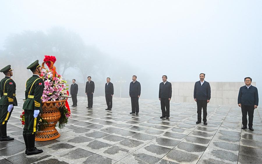7月7日至8日,中共中央總書記、國家主席、中央軍委主席習近平在山西考察。這是7日下午,習近平在位于陽泉市獅腦山的百團大戰紀念碑廣場,向八路軍烈士敬獻花籃。新華社記者 燕雁 攝